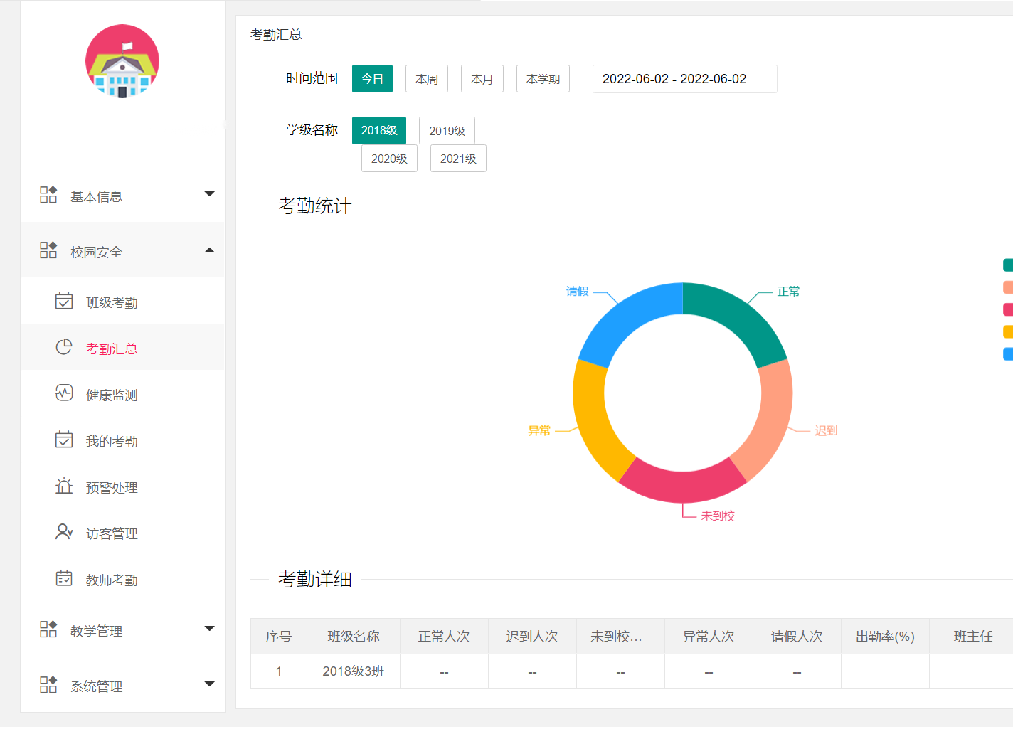 對黌舍的一切考勤數據停止匯總,停止可視化抒發,信息一目明了。